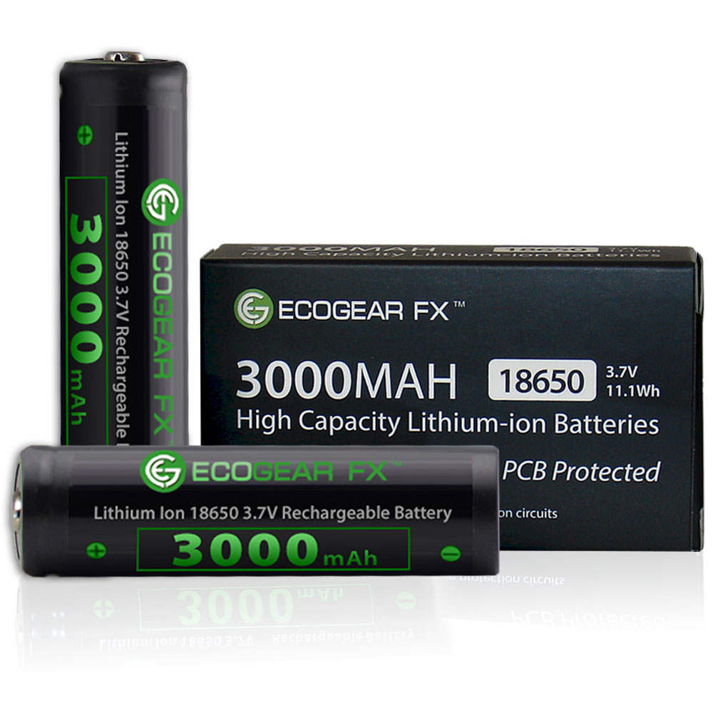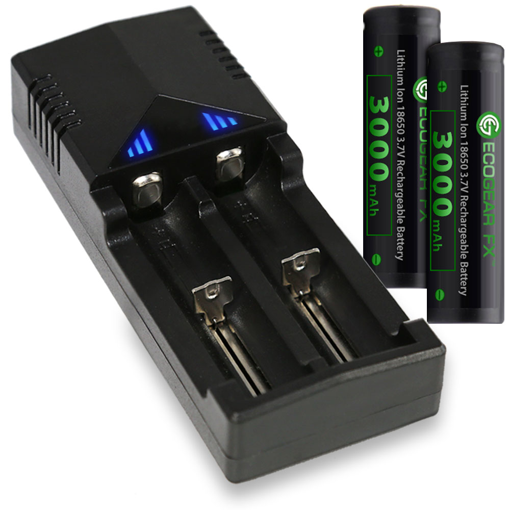 This is a complete Battery Kit which includes a battery charger with 2 charging bays, a 2-pack of 18650 button top batteries and a free battery storage case. The 18650 button top lithium-ion rechargeable batteries offer 3000mAh of power. The batteries offer low self-discharge and can be recharged up to 500 times. These 18650 batteries are a perfect choice for a high powered tactical flashlight or other low drain devices which require button top batteries. The battery charger has two separate charging slots, each of which charges and monitors a battery independently. Batteries can be charged simultaneously and the charger automatically detects the battery status and applies the appropriate charge mode. The chargers LED lights will display the batteries charging progress. Once charging is complete the charger will auto-stop. 18650 Batteries and ChargerCharger Specifications: • Charges 2 Batteries Simultaneously • Automatically Detects Battery Status and Selects the Appropriate Charge Mode • LED Lights Display Charging Progress • Auto-Stops Charging when Complete • Detachable Power Cord • Certified by RoHS, CE, FCC • Compatible with Batteries Li-ion: 18650, 17670, 18490, 17500, 17335, 16340 (RCR123), 14500, 10440 Ni-MH: AA, AAA Battery Specifications: • Capacity: Nominal: 3000mAh, Minimum: 2800 mAh • Internal PCB Protection: Prevents under-voltage at 2.5V and over-voltage at 4.25V • Nominal Voltage: Average 3.7V • Cut-off Voltage: 2.5V • Internal Impedance: less or equal to 180 milli-ohm (with PTC) • Cycle Performance: 90% of initial capacity at 400 cycles • Cycle life: > 500 cycles • Charge: Current = 0.5C (~1500mA) Voltage = 4.2 V End Current = 0.01 mA • Discharge: Current = 0.5C (~1500mA) End Voltage = 3.0V • Dimensions: Diameter: 18.5 mm, Length: 68.7 mm These batteries are NOT recommended for high-drain devices (i.e. Vaping Products).